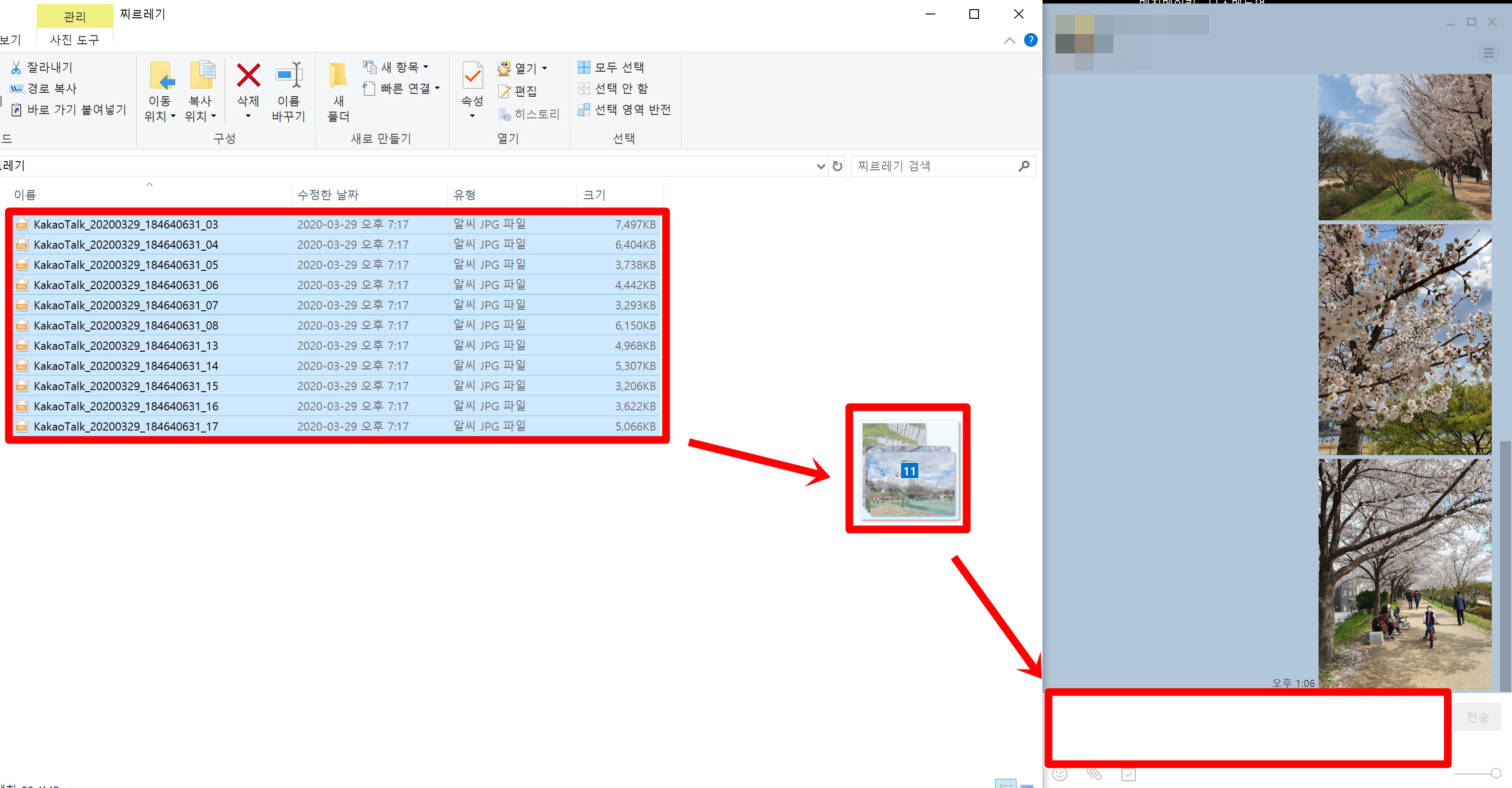 드래그를 해서 사진을 채팅장에 넣어도 한장씩 사진이 전송되기 때문에 상당히 불편함을 느끼시게 될 겁니다. 그래서 PC카카오톡 사진 묶어보내기와 묶어 저장하는 방법 지금부터 알아보겠습니다.