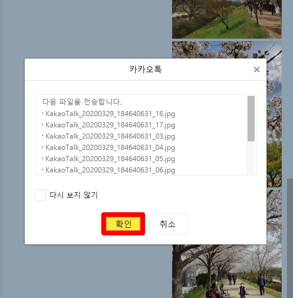 그럼 위와 같은 창이 뜨게 됩니다. 확인 눌러 주시면 사진이 전송됩니다.