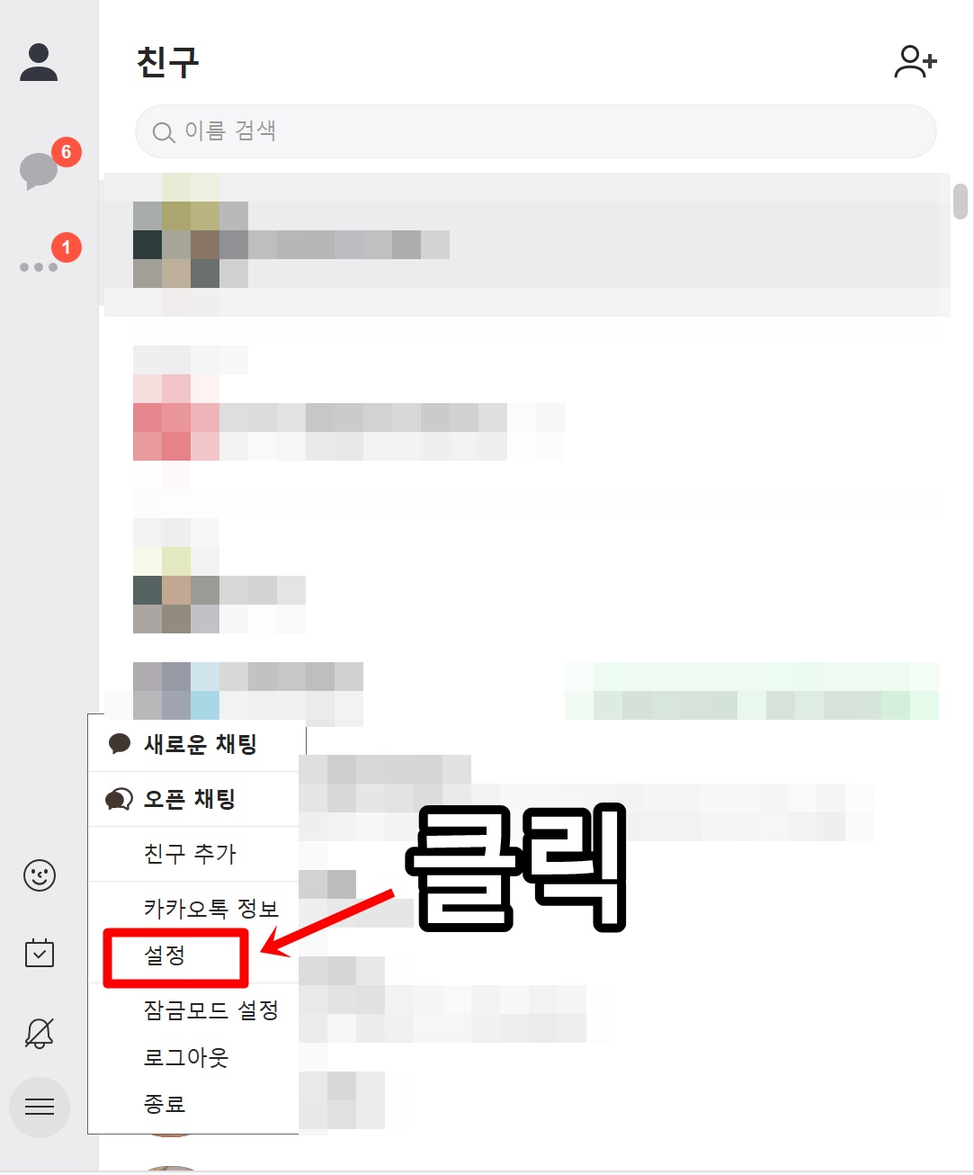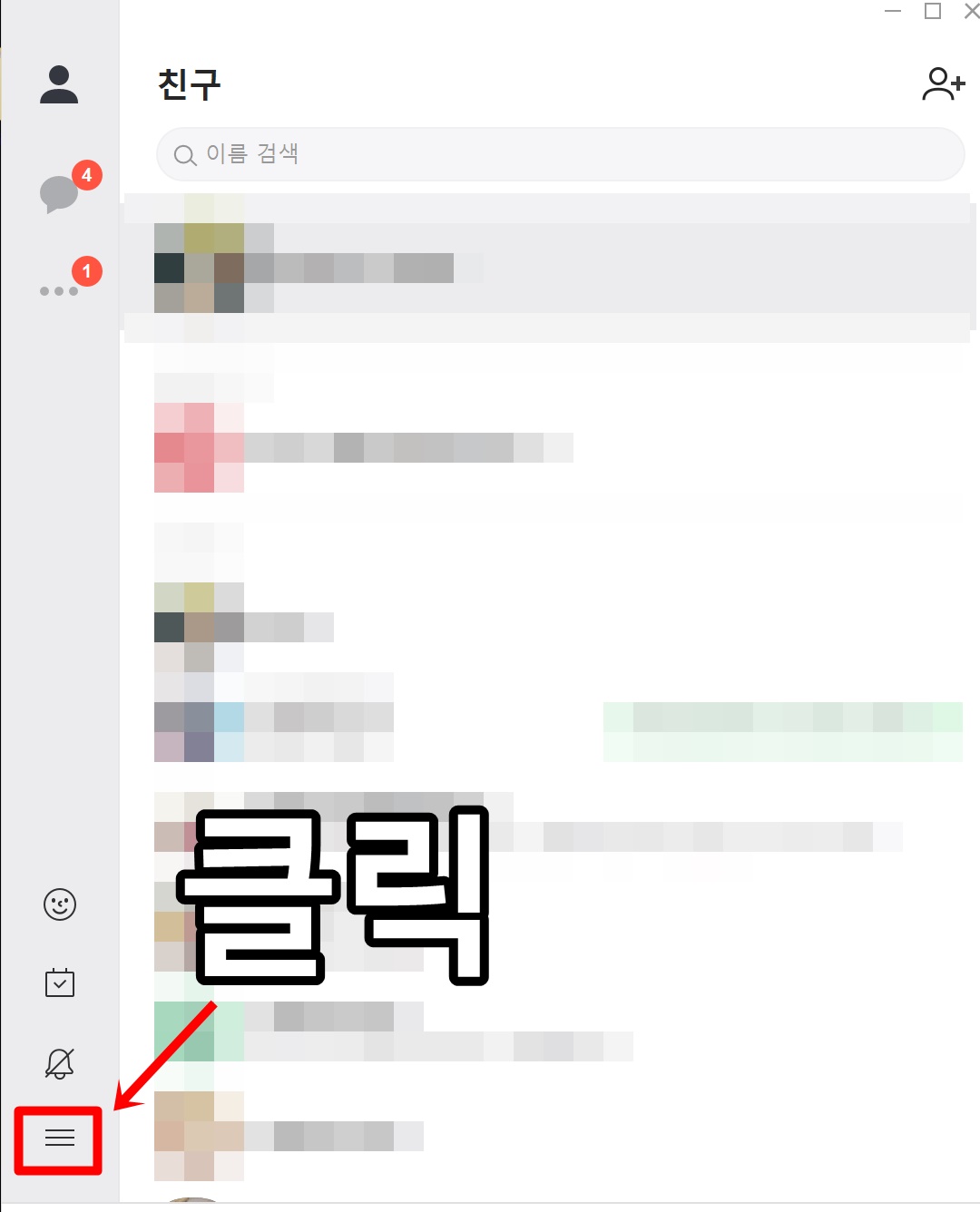 PC카카오톡 메인화면에서 좌측 아래쪽을 보면 밑줄 세개가 있습니다. 더보기 정도로 생각해주시면 되겠습니다. 클릭해주시면 설정이 나오게 됩니다. 설정 클릭해주시면 됩니다.