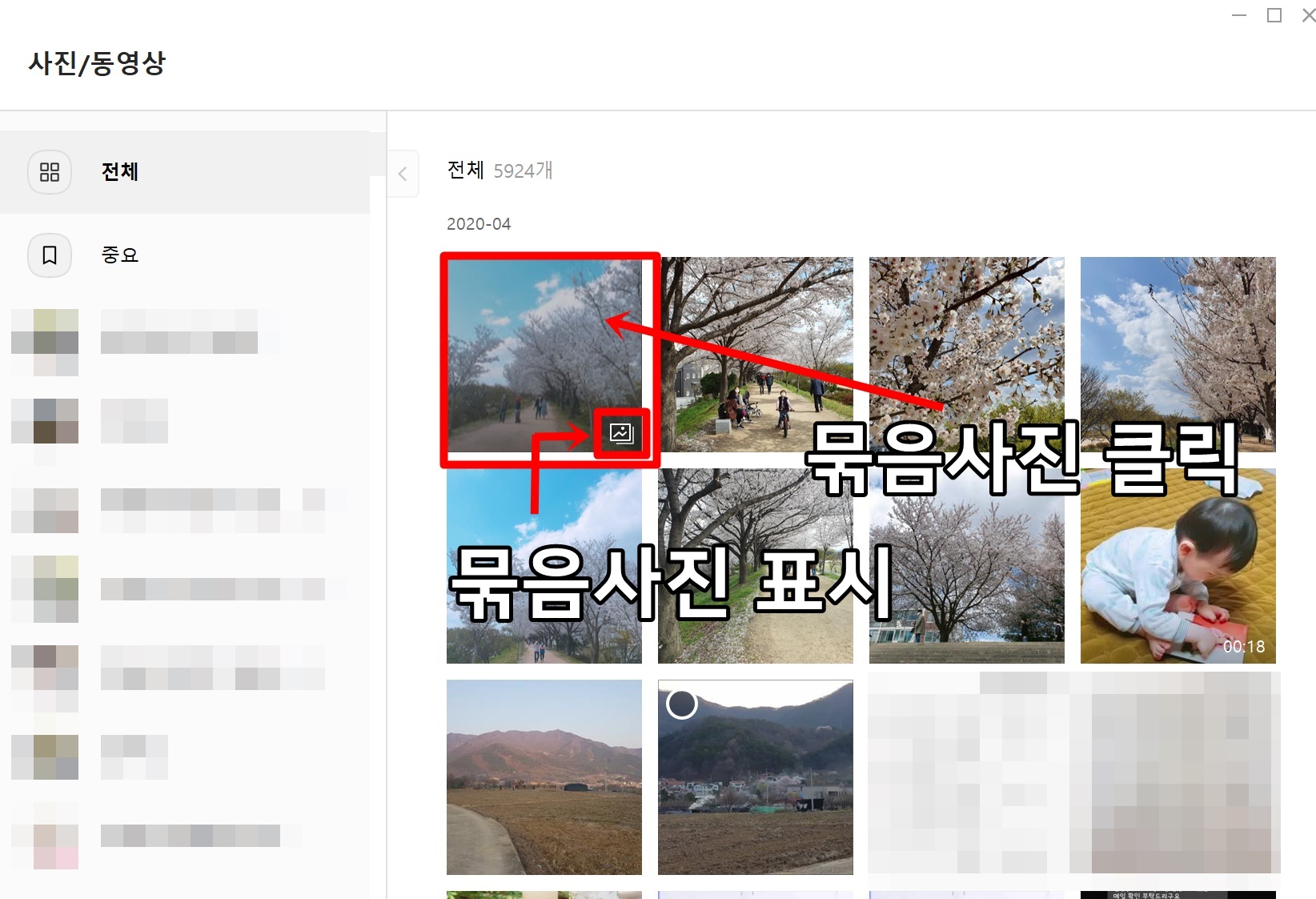 그럼 새로운 창이 하나가 더 생겨나게 됩니다. 여기는 본인의 채팅방에 있는 모든 사진들이 나오게 됩니다. 그리고 좌측 채팅방 별로 사진을 확인할 수 있습니다. 참고하시면 되겠습니다. 위 사진을 보시면 아시겠지만 묶음 사진을 사진 우측 하단에 표시가 되어 있습니다. 묶음 사진을 클릭해주시면 됩니다.