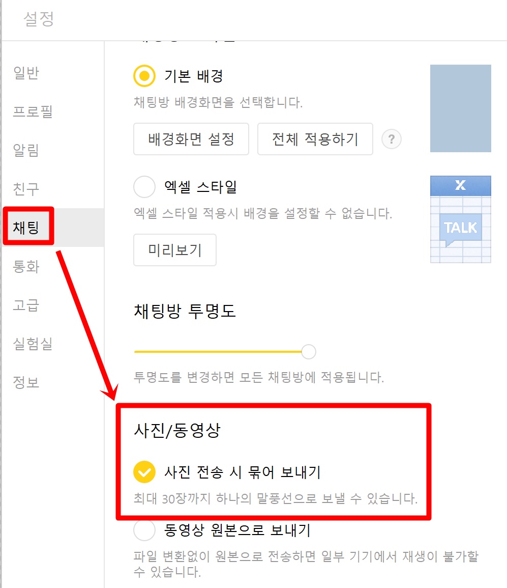그럼 위와 같은 설정창이 나타나게 됩니다. 메뉴 중 채팅이 있습니다. 채팅을 클릭해주시면 사진/동영상 메뉴가 있고, 사진 전송 시 묶어 보내기 메뉴가 있습니다. 체크해주시면 되겠습니다. 그럼 설정 끝입니다.
