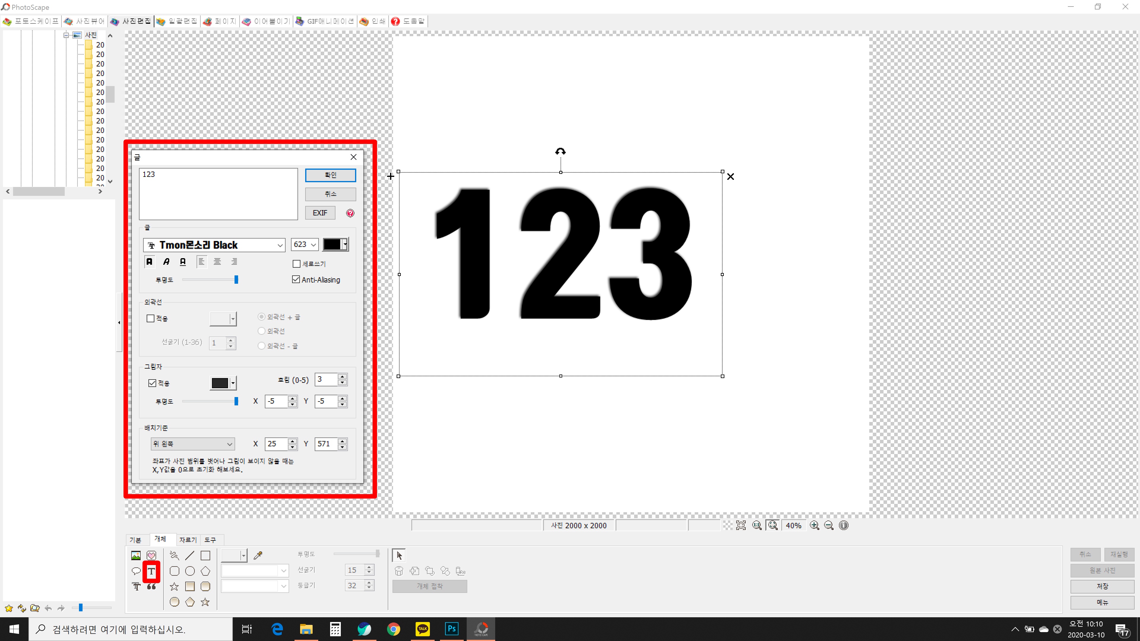 글씨를 넣는 건 메뉴에 T라고 적힌 부분을 클릭해주시면 글씨 창이 뜹니다 여기서 글씨를 편집해주시면 하는데요. 글씨를 편집하는 방법도 너무 쉽습니다. 윤각선, 그림자 등을 모두 표현 가능하십니다. 그리고 저는 유튜브 로고도 이 포토스케이프로 만들어서 사용하고 있습니다. 포토샵으로 하는 웬만한 것들을 모두 포토스케이프로 진행하실 수 있습니다. 물론 전문가가 사용하는 포토샵 기술에 비하면 정말 보잘것없지만 초보자들이 사용하기에는 안성맞춤인 거 같습니다.