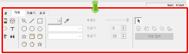 그리고 여기는 개체 메뉴인데요. 여기서는 사진을 불러오거나 스티커, 모양, 글씨 등을 넣을 수 있습니다.